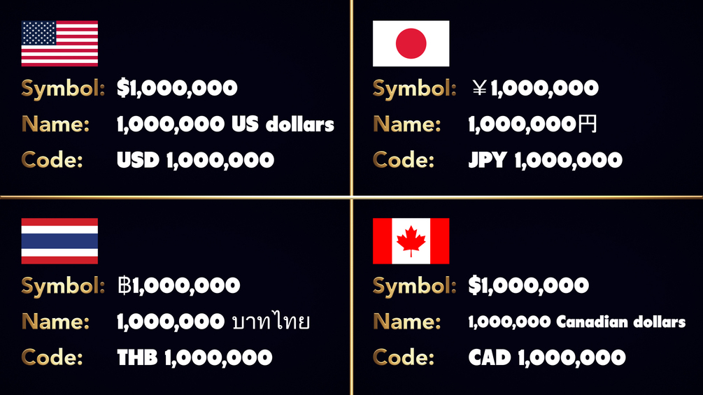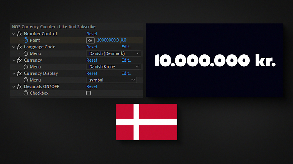 NOS Currency Counter uses the built in Java Script engine inside of After Effects to lay out currency correctly for different countries. All you need to do, is select the country you want your currency formatted for, and the preset will take care of it for you.